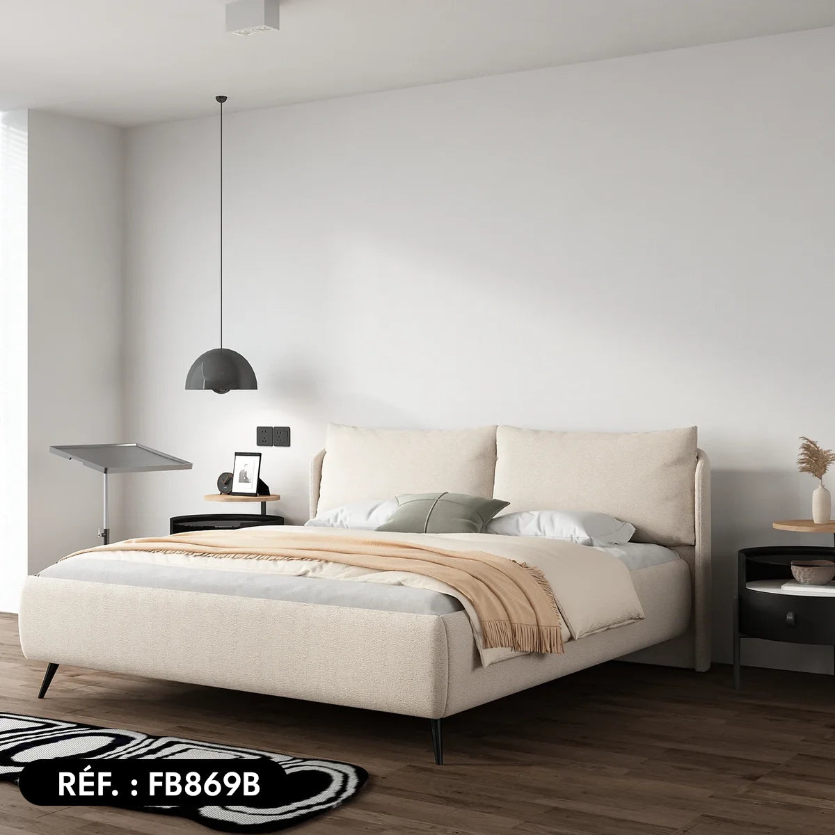 Conçu pour durer, il offre un excellent maintien grâce à ses lattes robustes. Son revêtement en tissu et ses pieds en métal noir à finition décorative en font un choix aussi pratique qu’esthétique.