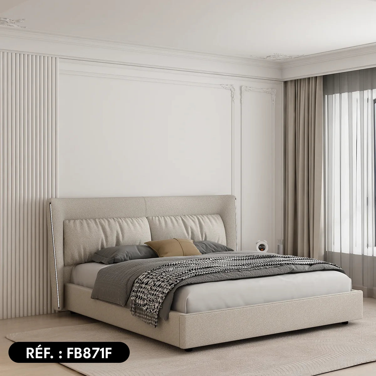 Sa structure en bois avec lattes assure un soutien stable et durable, tandis que son revêtement en tissu apporte une touche de douceur et d’élégance. Les lumières tactiles intégrées de chaque côté créent une ambiance chaleureuse et fonctionnelle, idéale pour vos soirées détente.